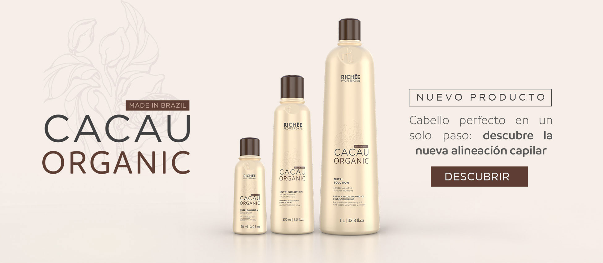 Cacau Organic Nutri Solution restaura y reduce el volumen. Formulado para actuar reponiendo lípidos, nutriendo y recuperando el cabello seco y reseco. Devuelve los nutrientes que ayudan a reforzar la estructura del cabello, dejándolo suave, sin encrespamiento, con un tacto liso y brillo intenso.